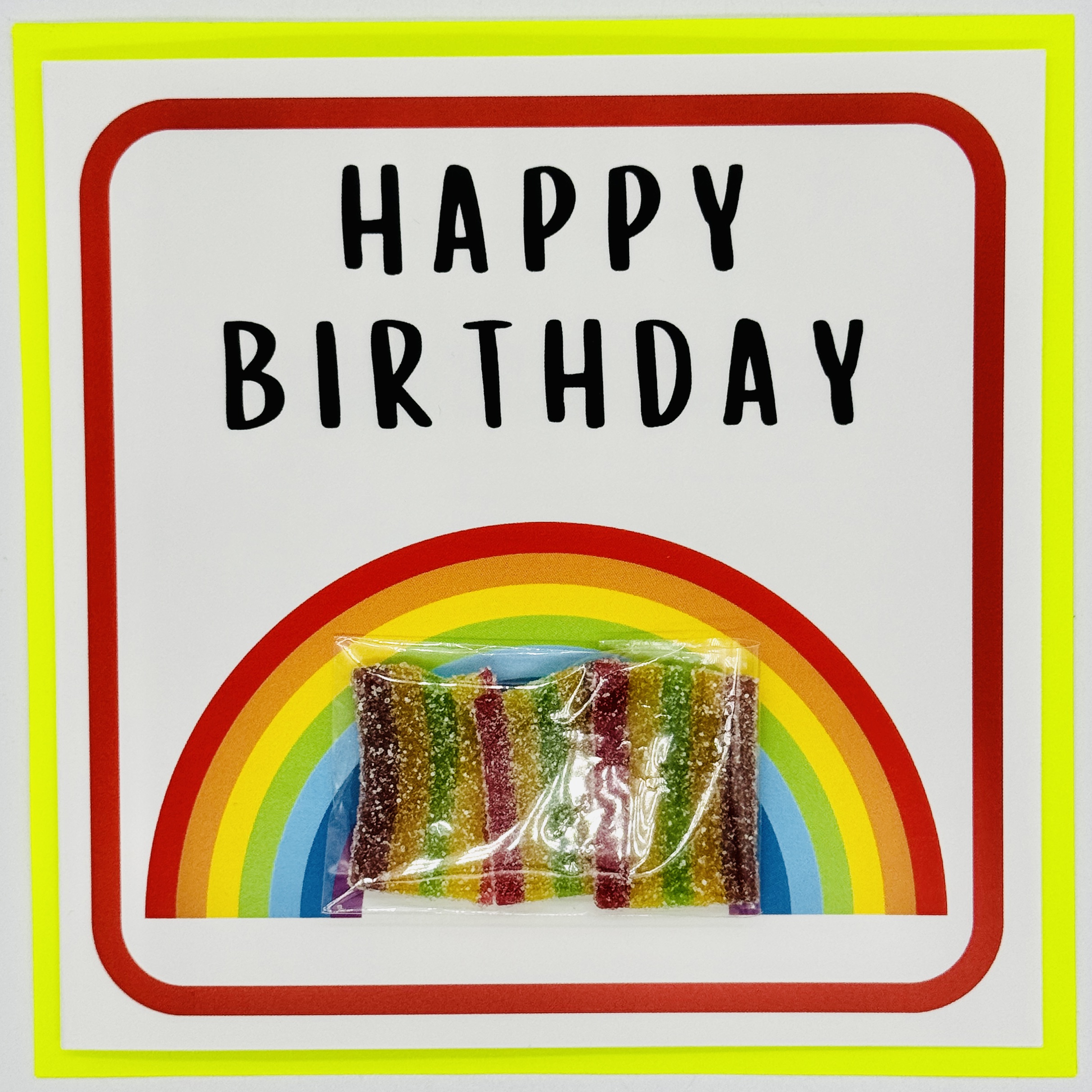 Happy Birthday Card with delicious fizzy rainbow belts presented in a food safe pouch, the card size is 145mm x 145mm printed on 300gsm FSC approved recycled card stock and comes with a neon bright envelope. all cards come with a best before date on the back of around 12 months and with all ingredients. The card is blank inside.